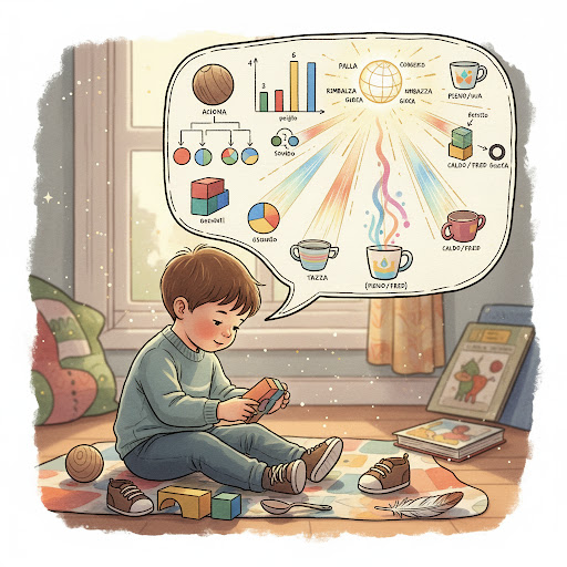 Il processo è direttamente proporzionale alla ricchezza dell’esperienza. Più numerosi sono i dati percettivi che caratterizzano un oggetto – il suo peso, la sua consistenza, il suo colore, il suono che produce, la sua reazione alla forza, il suo sapore – maggiori sono i “punti di integrazione” che la mente può creare, e di conseguenza, più solida e ampia sarà la sua concettualizzazione. Non è un caso che un bambino dedichi un impegno e una concentrazione attentiva straordinari nell’uso degli oggetti della vita quotidiana, dai giocattoli agli utensili domestici. Questa dedizione, spesso sottovalutata dagli adulti, è più che sufficiente a garantire una loro ampia e solida concettualizzazione. È attraverso questa immersione totale nel mondo fisico che il bambino costruisce le fondamenta cognitive su cui poggeranno tutte le future e più complesse strutture di pensiero astratto.