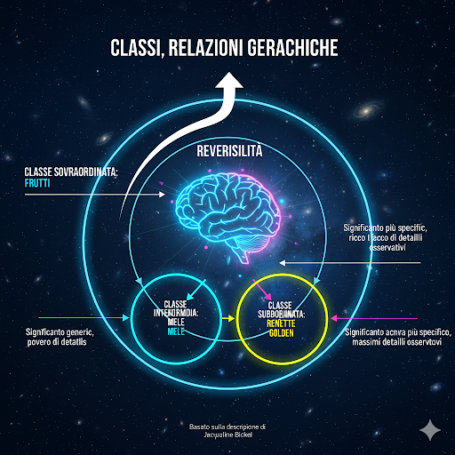 La “reversibilità” della classificazione logica, in questo contesto, si riferisce alla capacità di muoversi fluidamente tra diversi livelli di astrazione. Un bambino che capisce la relazione gerarchica non si limita a raggruppare oggetti, ma comprende come le categorie siano incluse l’una nell’altra. L’esempio fornito da Bickel è emblematico: “tutti i frutti includono le mele, e che le mele includono alcuni tipi, quali renette e golden.” Questo significa che la categoria “frutti” è un insieme più ampio che contiene al suo interno la sottocategoria “mele”. A sua volta, la categoria “mele” è un insieme più ampio che contiene le sottocategorie “renette” e “golden”.